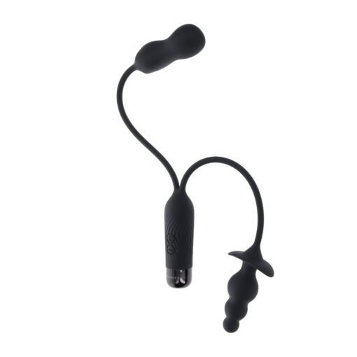 This double-motor toy features two vibrating shapes a beaded plug and a mini-vibe each tethered by a flexible cord. The round-tip plug consists of 3 bulbs that gradually increase in size to a wide safety base. The chunky-shaped mini-vibe narrows at the center and finishes with a flattened, blunt tip. A USB plug is neatly stored under the textured handle’s screw-off cap.